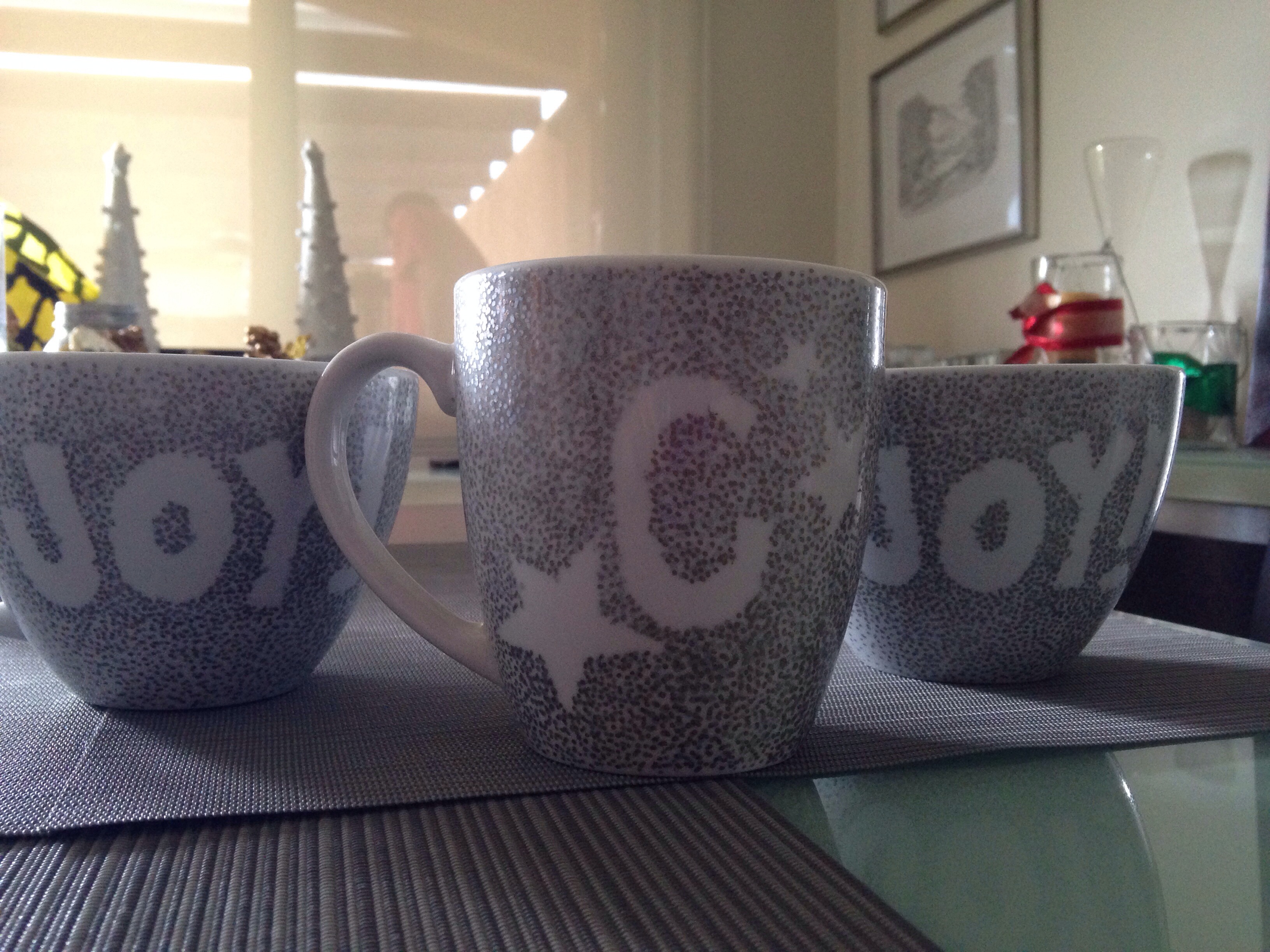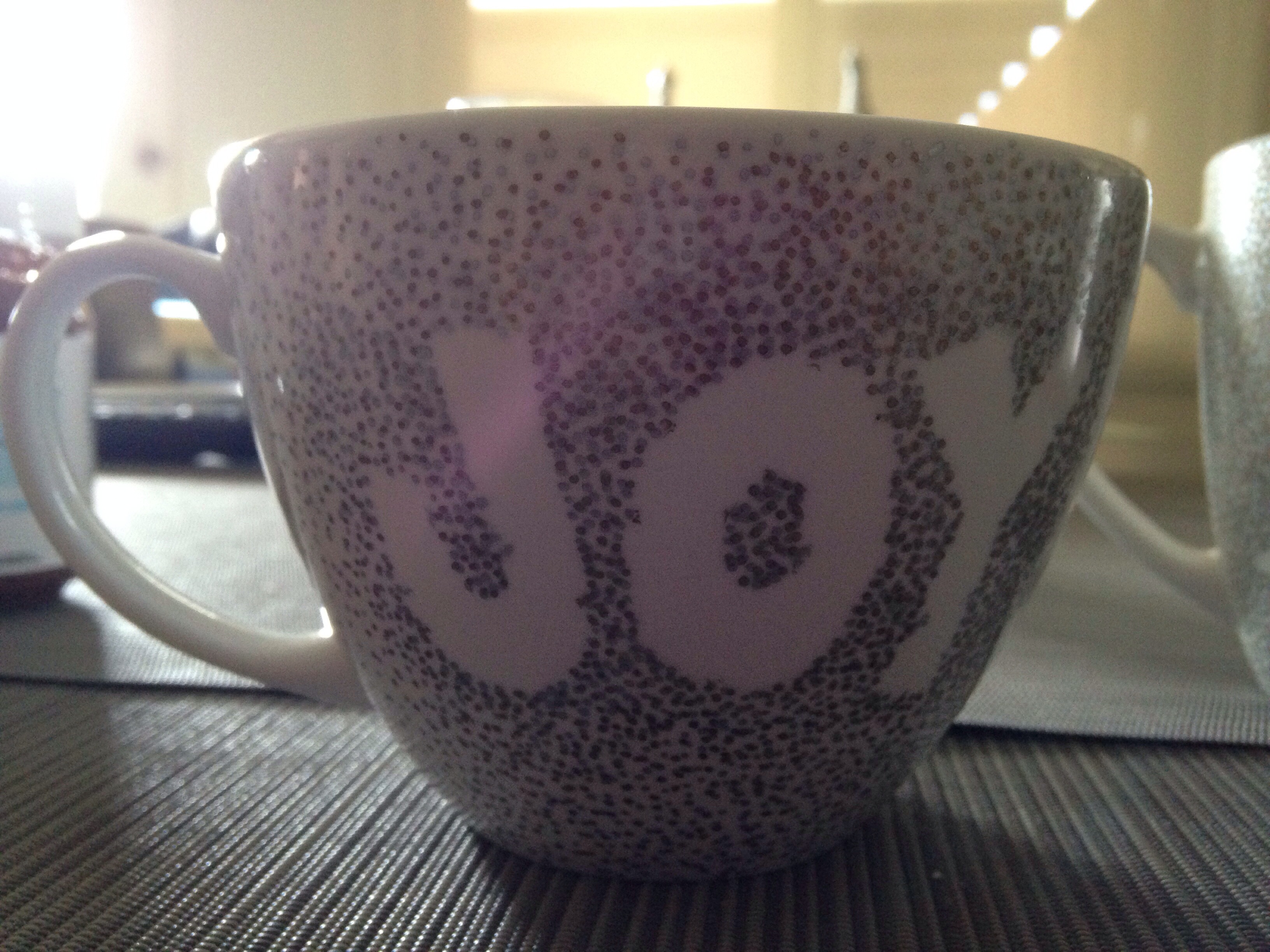 Haz el diseño que quieras en el tape o papel contact y cortalo, en mi caso hice 3 letras: «J, O, Y», luego pegalo en la taza que debe estar limpia, y empieza a hacer puntillismo al rededor con un color. Mientras mas te separas de las letras, mas espaciados deben estar los puntos. Luego haz puntos con el otro color, espera un par de minutos y despega el diseño. Ahora para sellar el color en la taza debes meterla al horno a 350 grados por 30 mins. Déjalas enfriar una noche y al dia siguiente puedes ya colocar los chocolates dentro, cubrirlas con celofán y amarrar un listón. Listo!