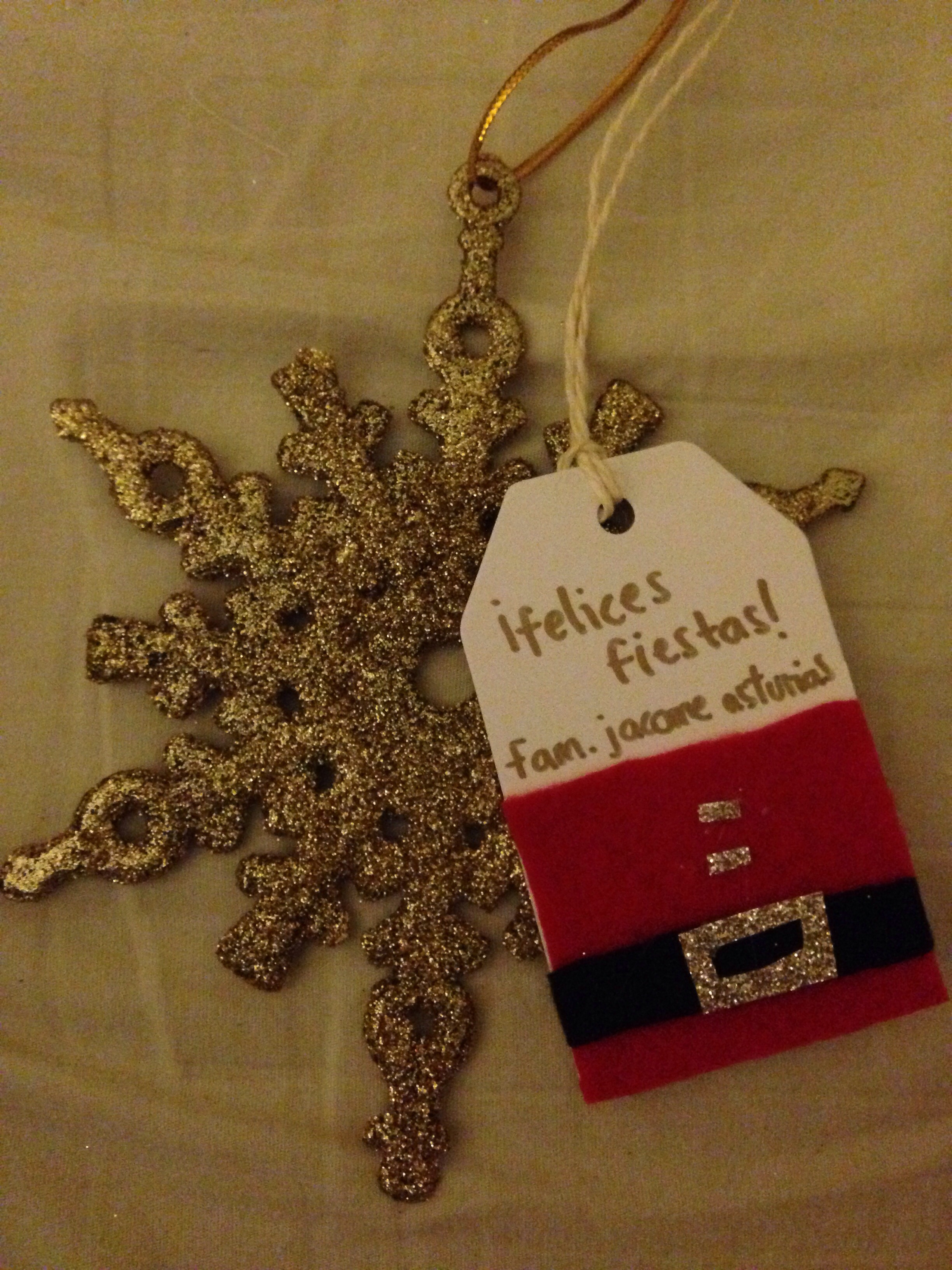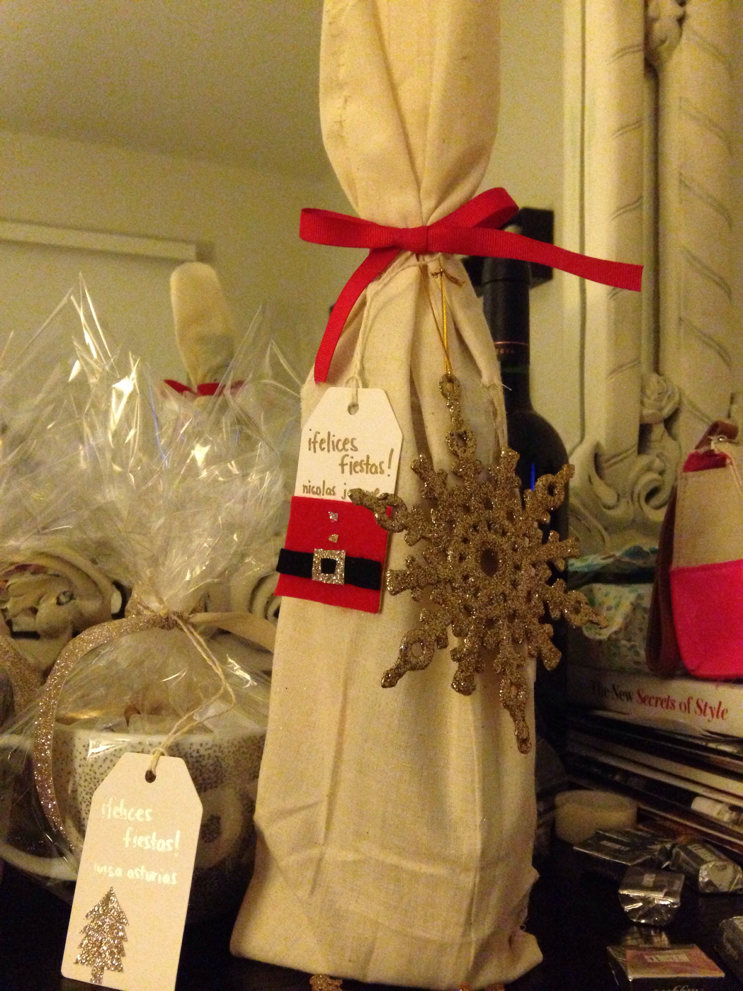 3. Bolsas para botellas: hay miles de formas de empacar una botella, me encanto hacerlo asi, tenia manta en mi casa, asi que hice dos diferentes: una cosiendo la orilla, y la otra pegandola con silicona liquida. La cosida es mas resistente pero se descose, ideal si se cosen solo los laterales, no la parte inferior. Luego la cerre con un liston y agregue un adorno (copo de nieve) y unas tarjetitas.