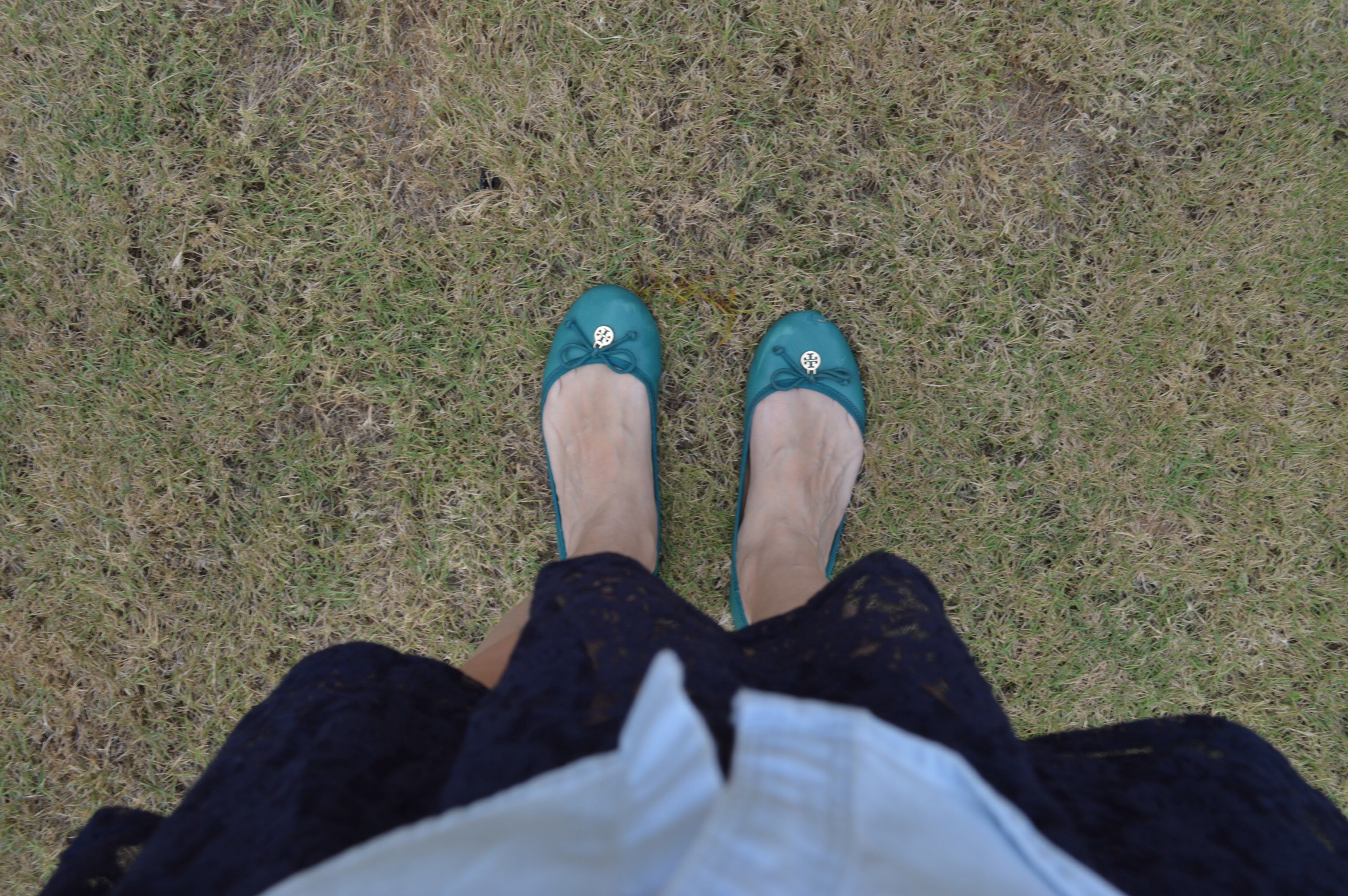 Ahora que estoy dando pecho, en lo personal, prefiero las blusas de botones, no tengo muchas y la mayoría son de jeans, así que es casi mi uniforme. Este fin de semana había tanto calor que no podía ponerme pantalón ni leggins con esta blusa, así que opte por una falda de encaje que me encanta (y ya me queda), especialmente porque me gusta la combinación de texturas. A veces me da miedo experimentar con las texturas, pero este es el momento para hacerlo porque estan de moda las combinaciones diferentes (aunque esta no es tan fuera de lo comun). Para complementar, no tenia mucho tiempo para arreglarme, asi que solo me maquille un poco, me hice una trenza, y me puse unos flats de un color mas vivo.