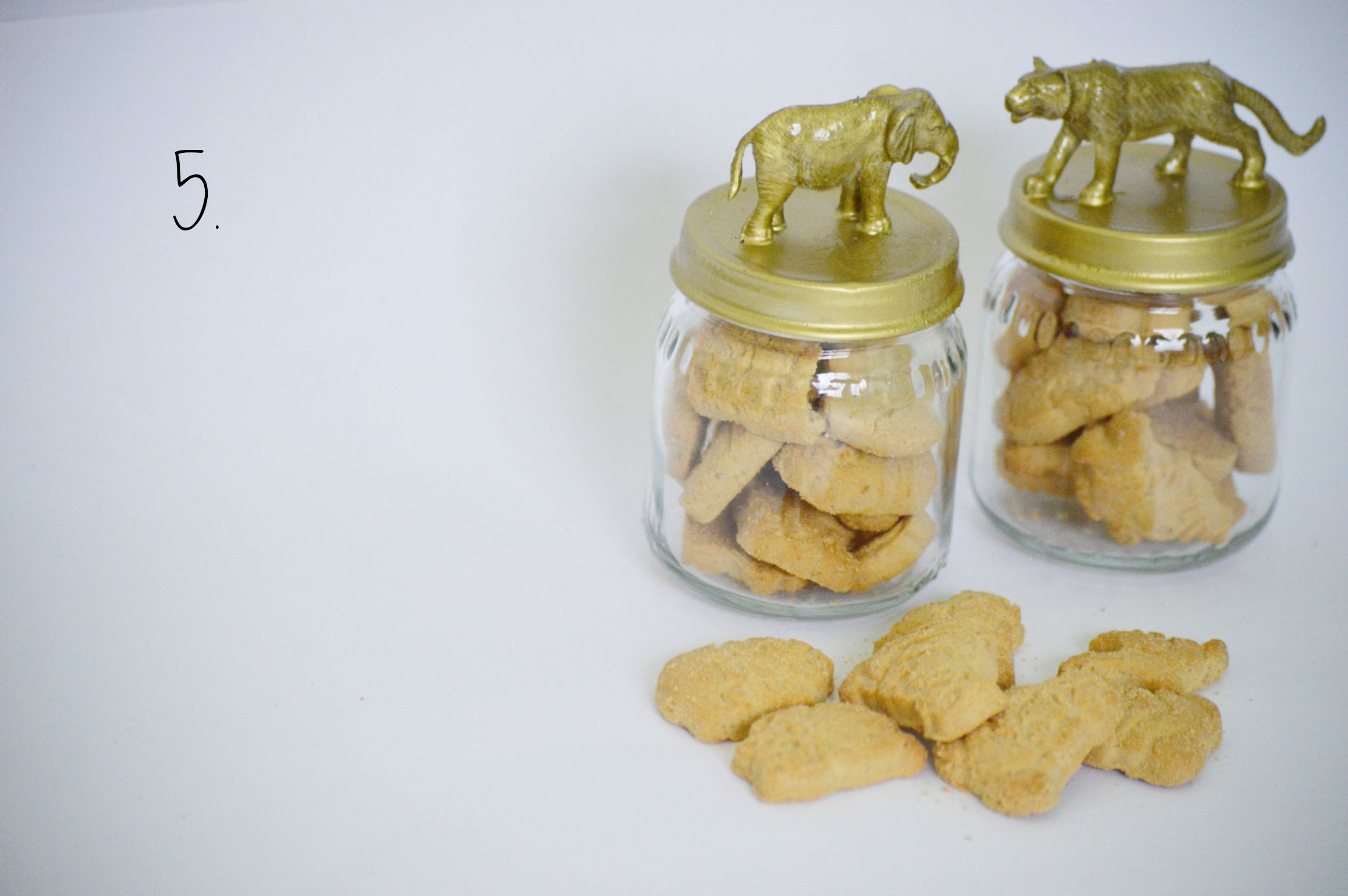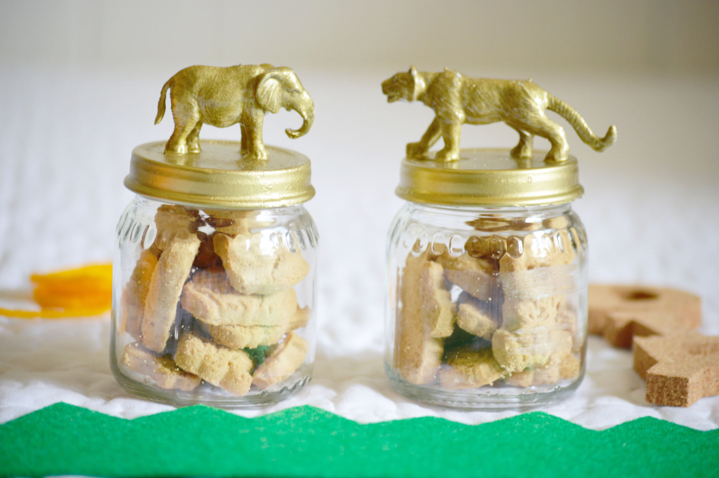 Para el cumpleaños de mi hijo hicimos estas bellezas de frascos con el tema de la selva. Realmente se puede hacer con el tema que quieras mientras existan los muñequitos. Puedes colocar galletas, dulces, o cualquier otra cosa dentro, y ¡se ven lindos!