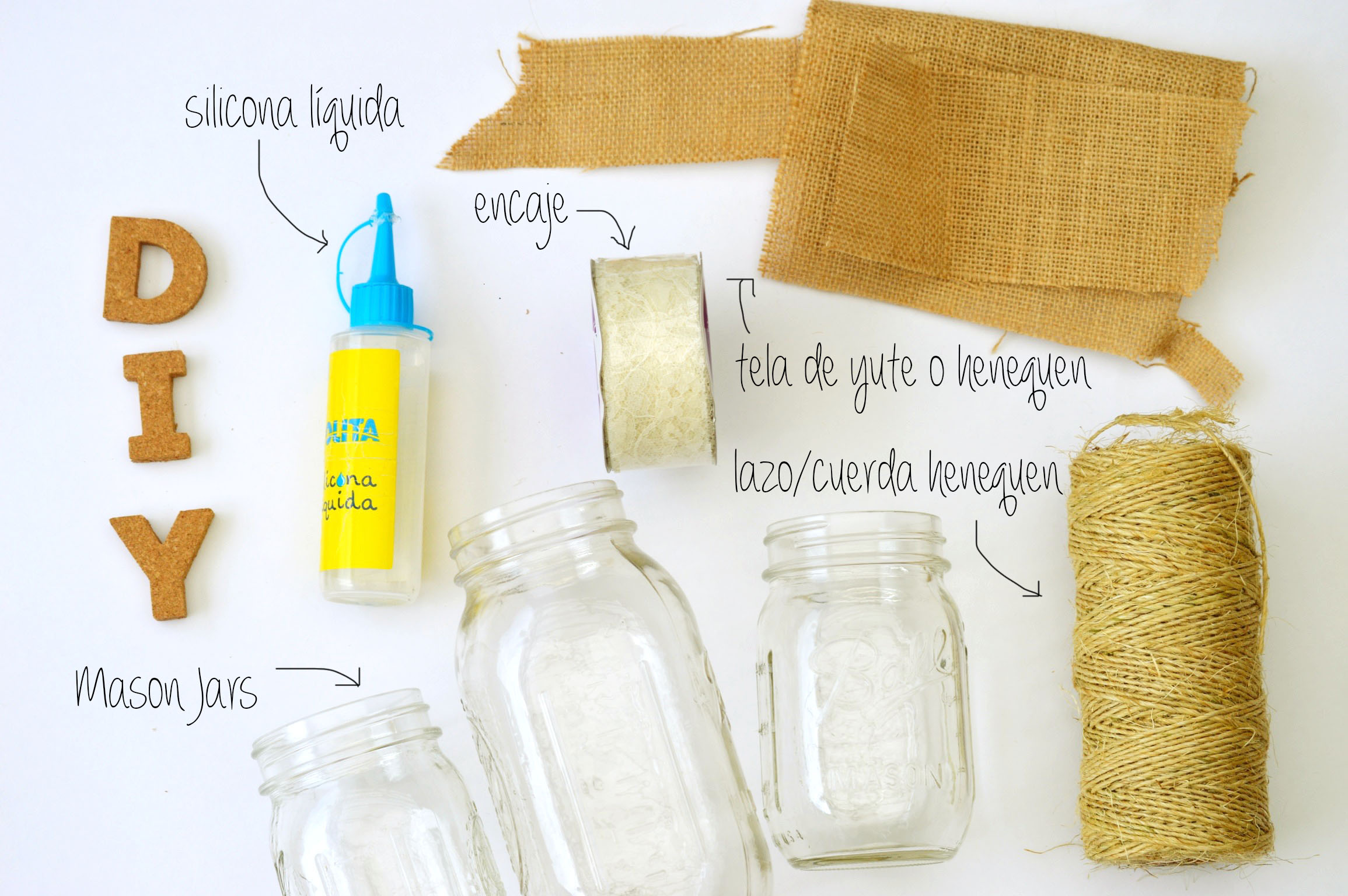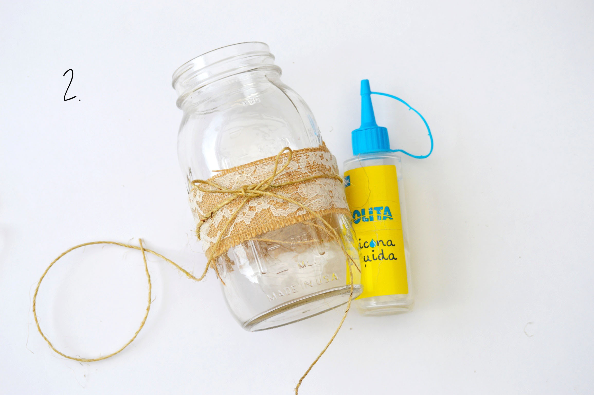 Primero mide la tela en el frasco para que cubra lo que quieras cubrir, y corta.  Luego, asegurate que cubra el diámetro completo y corta también.  Corta el encaje y el lazo/cuerda. Paso 2 Mason Jars 2