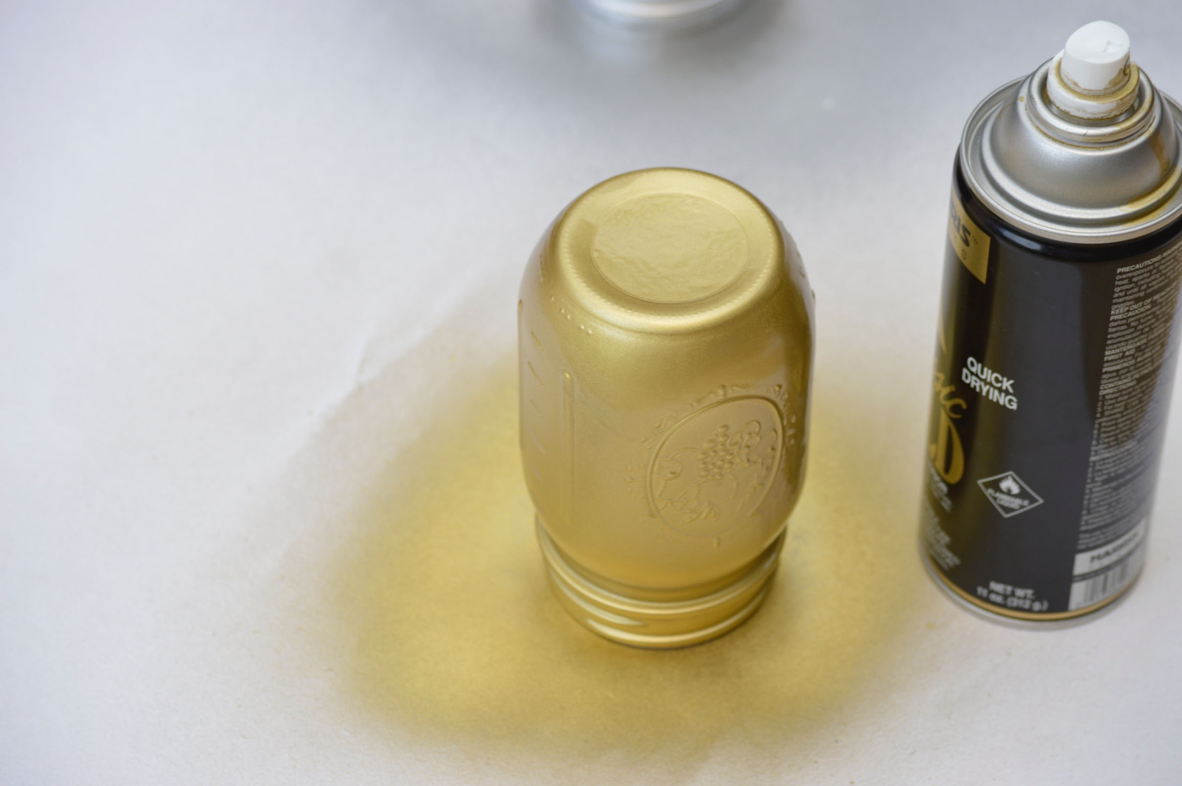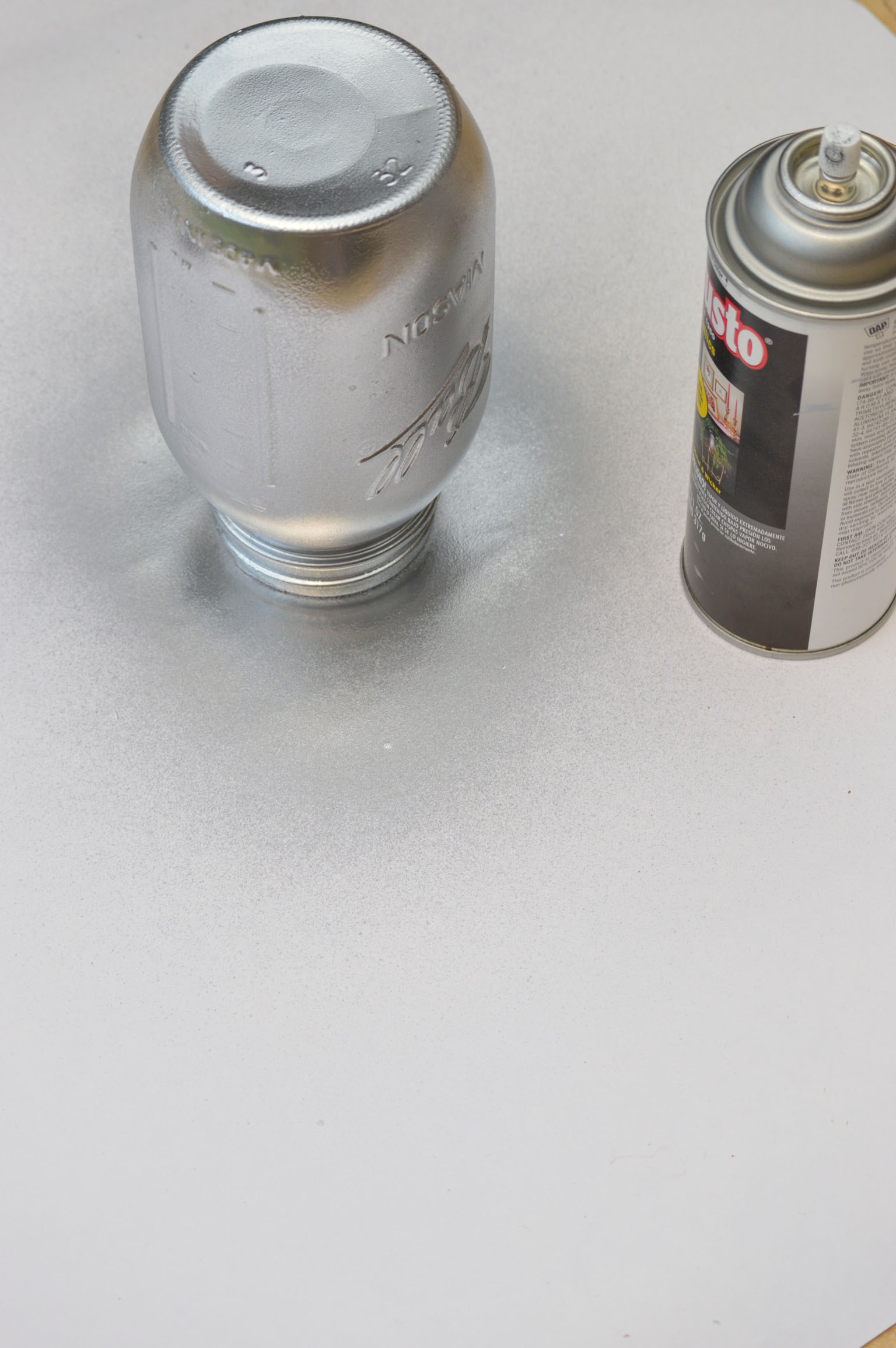 Coloca tus frascos al aire libre sobre una cartulina y pintados con el aerosol.  Deja unos 15 cm de distancia entre la pintura y el frasco para que quede mejor. Espera unas horas a que sequen.  ¡Listo!